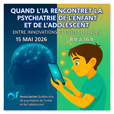 L’ Association québécoise de psychiatrie de l’enfant et de l’adolescent (AQPEA) vous propose une nouvelle journée de formation pour les psychiatres de l’enfant et de l’adolescent du Québec, les résidents en psychiatrie de l'enfant et de l'adolescent, les étudiants, les professionnels et gestionnaires en santé mentale et en milieu scolaire
